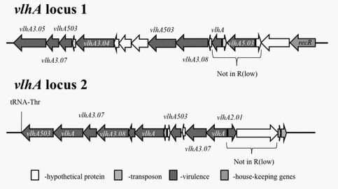FIG 2 Identification of Mycoplasma gallisepticum ts-11 vlhA virulence loci. Forty of the virulence genes identified in M. gallisepticum were annotated as coding for the variable surface protein VlhA. These vlhA genes mapped to 6 loci within the ts-11 genome. Two of these loci are depicted, and locus 1 is of particular importance in that it houses the vlhA genes that were targeted for differentiating the ts-11 strain from natural field isolates.