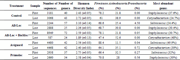The bacterial community of the first sample from the first cycle was statistically different (P < 0.05) from the last sample from the fourth cycle for all groups. The fact that the control house was statistically different indicates that time has a significant impact on the litter bacterial community. Table 7 shows the effect of time and treatments on litter composition. The first sample from all groups was dominated by the phylum Firmicutes however there was some variation in the most abundant genus. In the control group and All-Lac + BioMos treatment, Staphylococcus was most abundant while the other groups were dominated by Salinococcus. Firmicutes were also the most abundant phylum in the last sample in all treatment groups except the flocks receiving All-Lac + BioMos, which were dominated by the phylum Actinobacteria. Over time, only the Primalac group did not exhibit an increase in Actinobacteria. A decrease in the Firmicutes/Actinobacteria ratio from the first to last sample was observed in the control group compared to the average of the ratio observed in the litter from treated chickens (1.57 versus 1.87). This observation suggests that continued administration of bacteriotherapy may be necessary to maintain the abundance of the Firmicutes in the litter. Corynebacterium, Brachybacterium and Brevibacterium were the most abundant genera from the phylum Actinobacteria. This shift in bacterial communities over multiple production cycles is not unexpected given the physical differences between fresh and used litter. Past studies have shown that members of the phylum Actinobacteria may be involved in the decomposition of organic material such as the wood shavings used as bedding in this study [64].