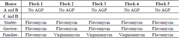Table 1. Experimental design and treatments for broiler chickens raised on 3 commercial poultry farms. Two houses on each farm received no antibiotics; two houses received flavomycin (2.2 g/T) in the starter, and grower feed and either flavomycin (2.2 g/T) or virginiamycin (22 g/T) in the finisher feed.