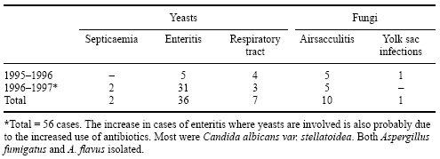 Table 6c. Specific bacterial pathogens isolated from ostrich chicks younger than 3 months: yeast and fungi.*
