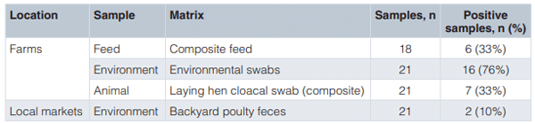 Results: A significant presence of Salmonella was detected in the 21 farms evaluated, with a frequency of 76% (95% confidence interval (CI): 53-92) in environmental surfaces, 33% (95%CI: 15-57) in pooled cloacal swabs from layer hens, 33% (95% CI: 13–59) on feed samples, and 10% (95%CI: 1-30) in backyard layer feces from traditional local markets. The dominant serovars detected were S. Infantis and S. Typhimurium.