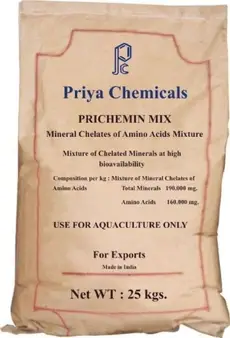 Prichemin-Mix for Aquaculture consists of Mixture of Mineral Chelates of Aminoacids developed specially to act as Feed Attractant for Aquatic population, Fish, Prawn and other aquaculture species
